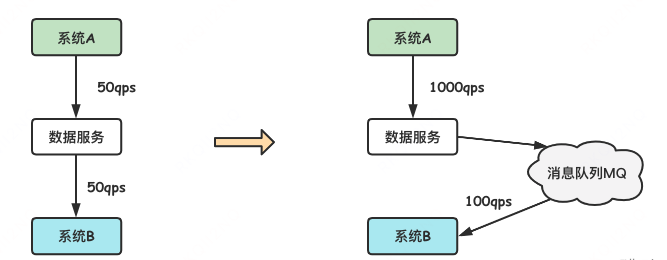 - 队列的削峰填谷,流量削峰还有个形象的名字叫做削峰填谷,其实就是指当数据量激增时,能够有效地隔离上下游业务,将上游突增的流量缓存起来,真正地填到谷中,以平滑的方式传到下游系统,避免了流量的不规则冲击。比如,有个活动页面平时也就 50qps,某一特殊时刻访问量突然增多,能达到 1000qps,但是当前系统的处理能力最多为 100qps,这个时候可以通过消息队列来进行削峰填谷,如下图所示。