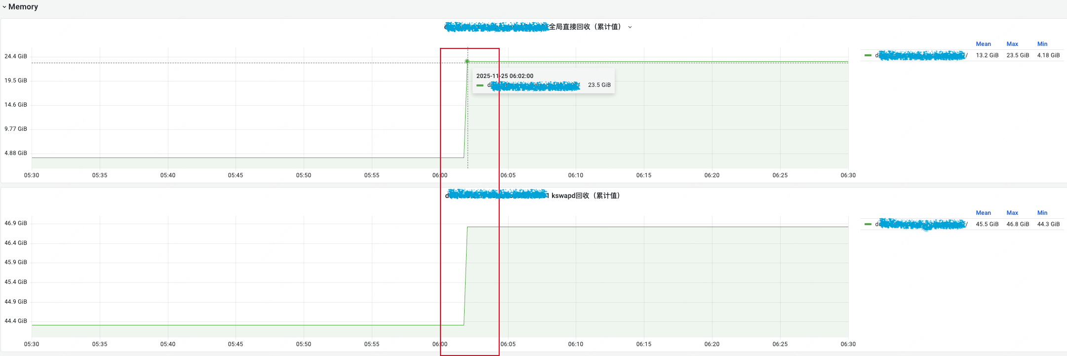 首先观察HUATUO故障定位大盘,看看毛刺时间点有什么特别的事件发生。如下所示,监控大盘显示有内存回收发生,回收量曲线直接出现90度上升。