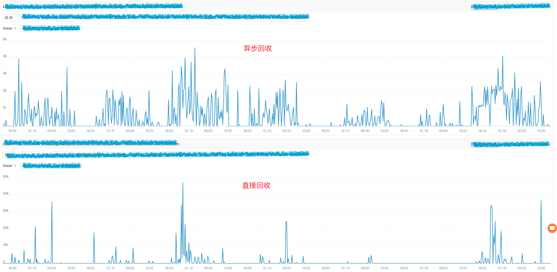 接下来需要搞明白,为什么会出现整机的内存回收。业务同学提供了多个出问题的容器。继续观察发现出问题的机器和原来一直没有问题的机器的机型不同。我们分别对比这些机器的内存直接回收和kswapd曲线。