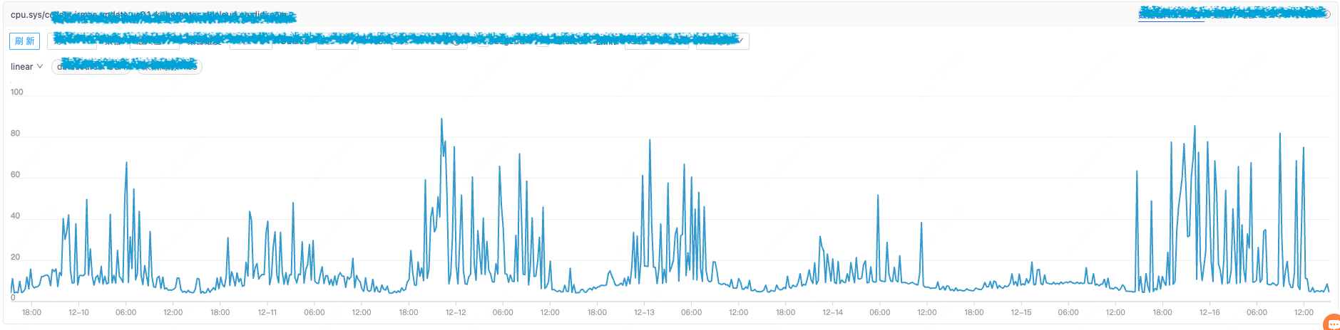 从图中可以看到直接回收出现的相当频繁,数量级也是相当的大,甚至能达到1秒回收50G的程度,下图的cpu.sys的趋势与直接回收大致相同,最坏情况甚至能够达到80%。