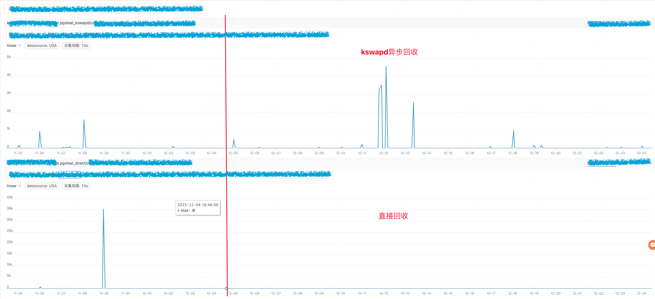 - 无问题机器为双路服务,总内存500GB,每node 250GB,两个 kswapd 线程异步回收这些内存。这样一来,在内存短缺时,两者的回收速度是截然不同的,所以无问题服务器能够通过 kswapd 的不断活跃来避免直接回收,但是经常出问题的服务器的一个 kswapd 有时就来不及回收到足够的内存,应用程序不得不进入直接回收,从而造成一个个大毛刺。