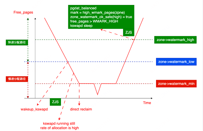 Linux 内核的内存管理有三条水位线。分别是min, low, high。 当 free 内存低于 low 时,会先启动 kswapd 异步线程做回收,回收的目标是让 free 内存回到 high 以上。如果业务进程内存使用非常剧烈,分配速度比 kswapd 的回收速度还要快,那么就会击穿 min 和 low 之间的内存量,当 free 内存降低到 min 以下时,所有试图分配内存的进程,都将在进程上下文进行同步的直接回收,这会导致严重的业务毛刺。 我们本文的策略就是保证 min 水位不变,提高 low 和 high 水位,让 kswapd 尽早起来干活,拉大 low 和 min 的间距可以提供足够的缓冲区。