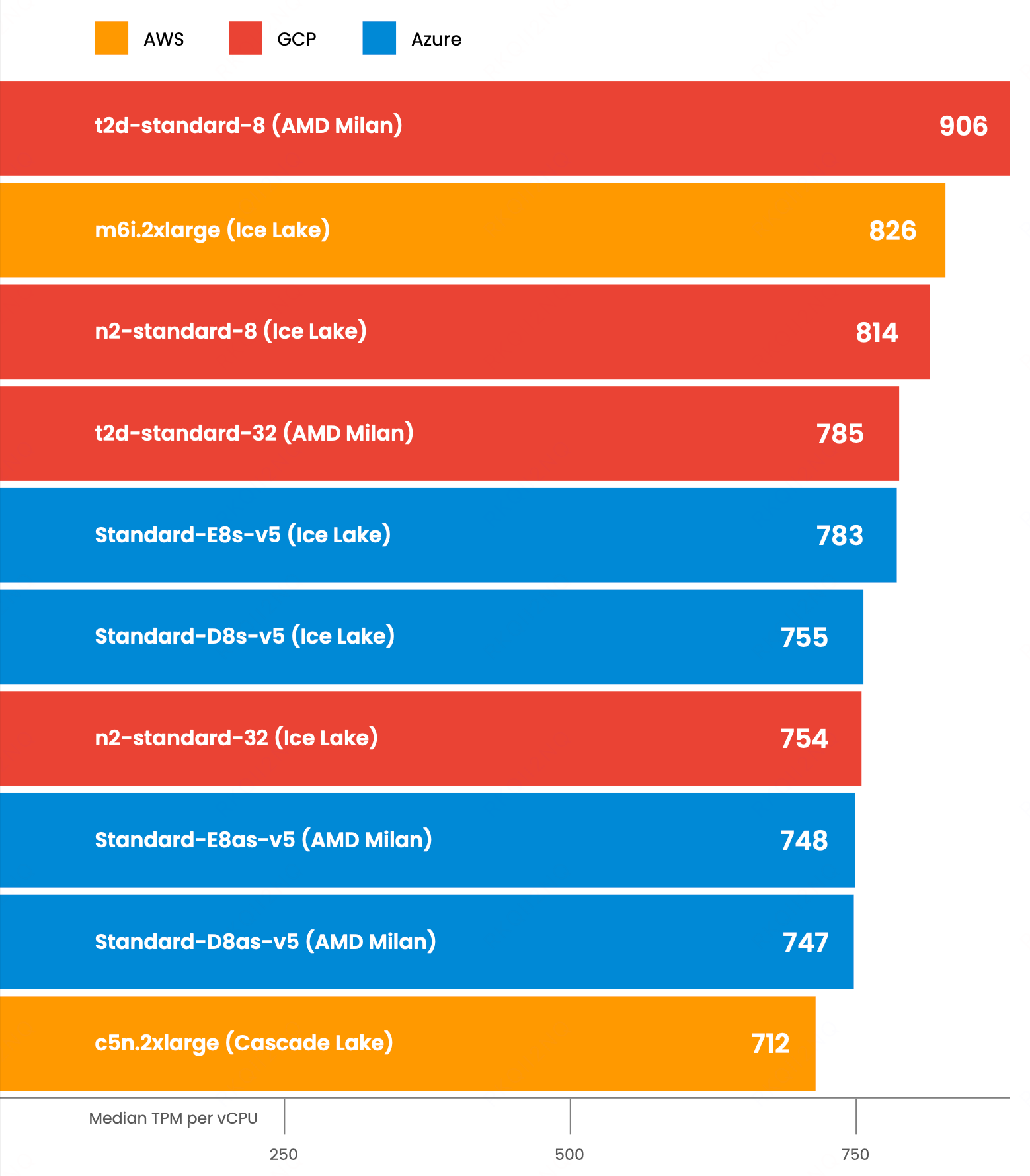 在 OLTP 和 CPU 基准测试中,可以发现在特定实例类型上运行的小型实例,总是占据性能优势,无论 CPU 平台、云提供商还是实例类型如何。根据实例类型,这些差距从 5% 到 30% 不等。