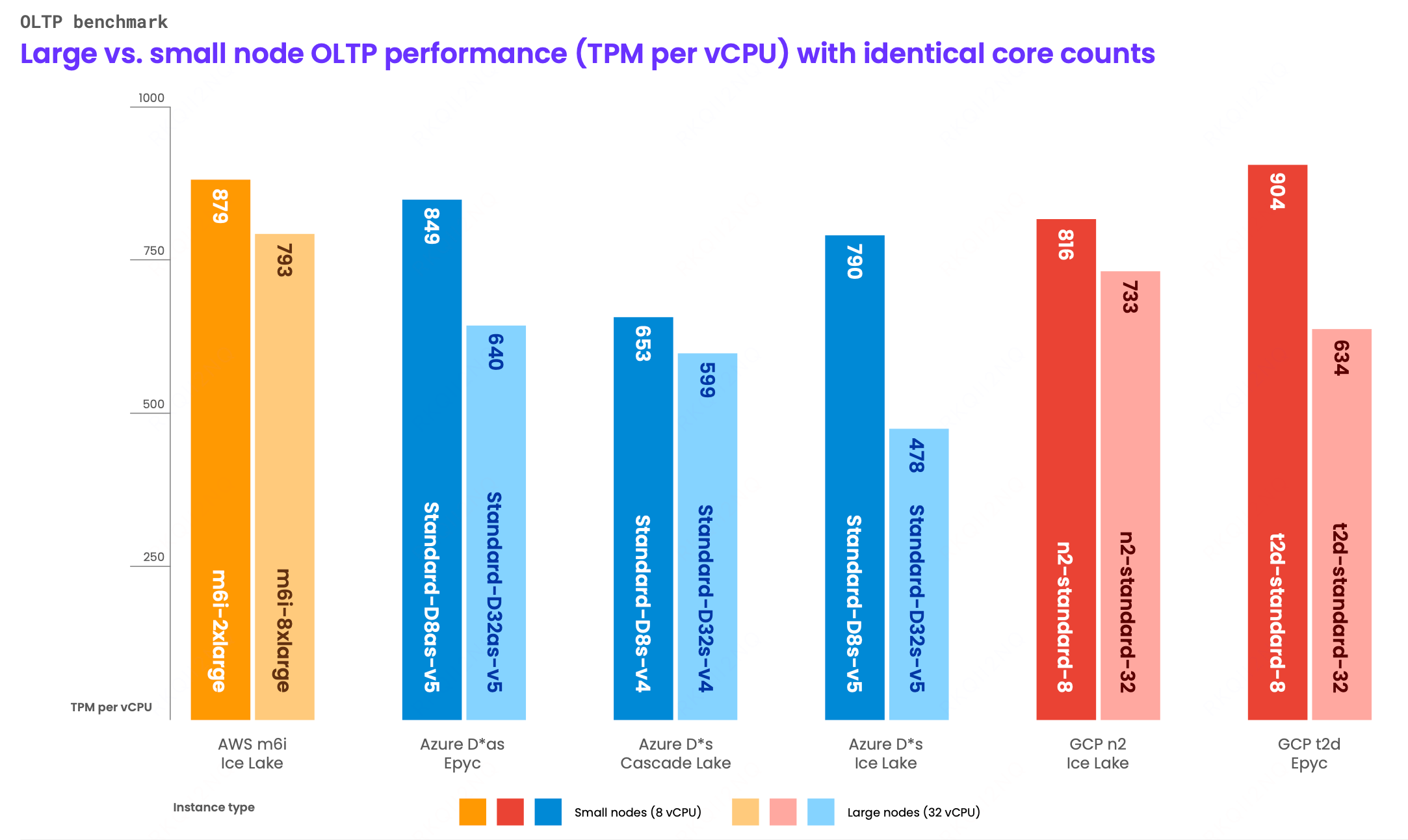 上述资源划的数据来自AWS,阿里云,但并未说明背后的思考。Cockroach Labs 2022 年对主流公有云 56 种实例类型和 107 种配置进行公正测试,以帮助用户选择最佳的工作负载实例(https://www.cockroachlabs.com/guides/2022-cloud-report),回答用户“使用更多较小的节点,还是使用较少的较大的节点更好?”。该报告给出丰富的数据样本,并开源所有测试用例(https://github.com/cockroachlabs/cloud-report)。为比较不同实例性能,基准测试均以 per-vCPU 性能展示。