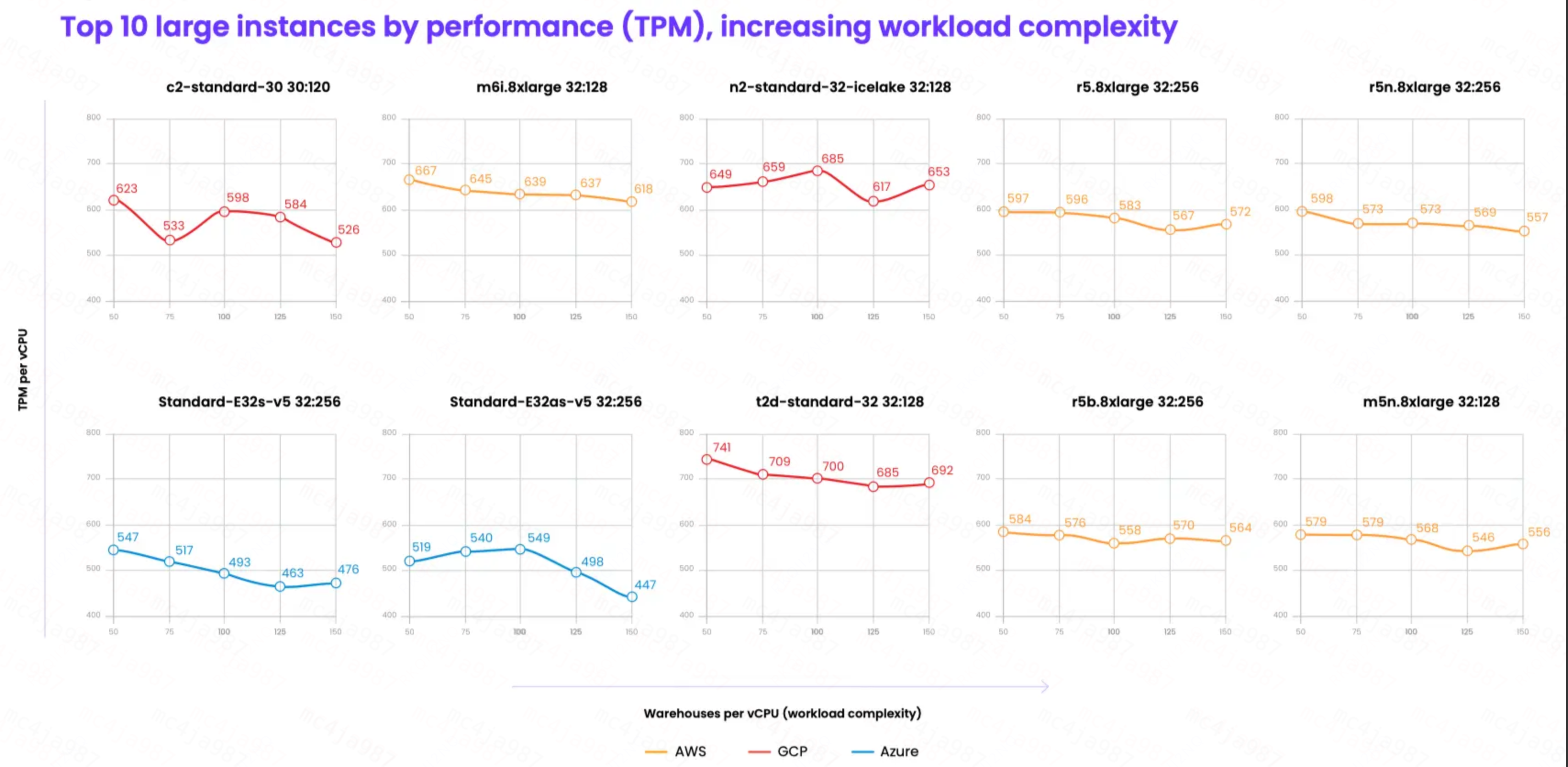 无论您选择哪个云,所有三个提供商都提供具有竞争力的性价比解决方案。在固定的工作负载复杂度为 1,200 个仓库时,更大的节点提供了最佳的性价比,主要因为小节点的价格中存储占比更大。这确实赋予了大节点定价优势。