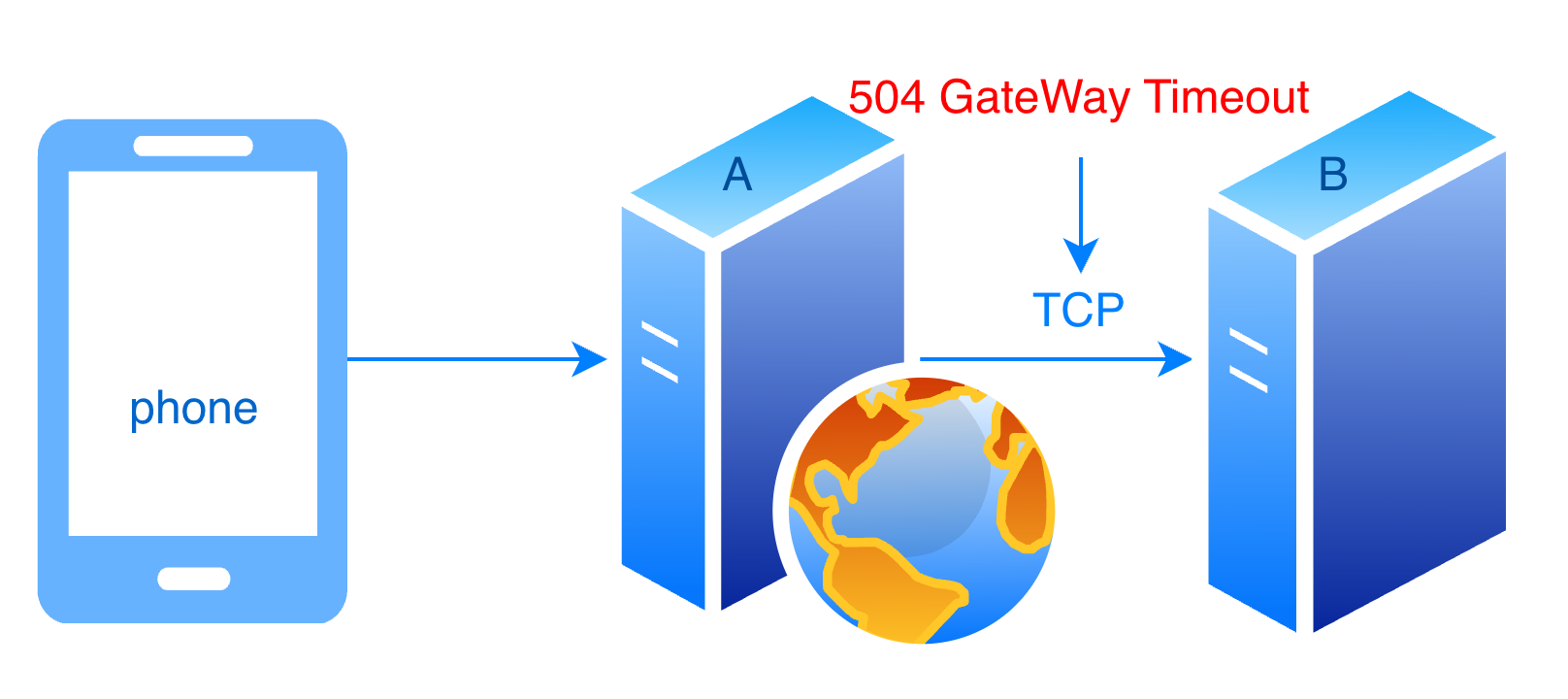 当 A 服务访问 B 服务时,若出现大量建立连接或者传输失败超时,则会返回 504 超时错误。网络架构简图如下: