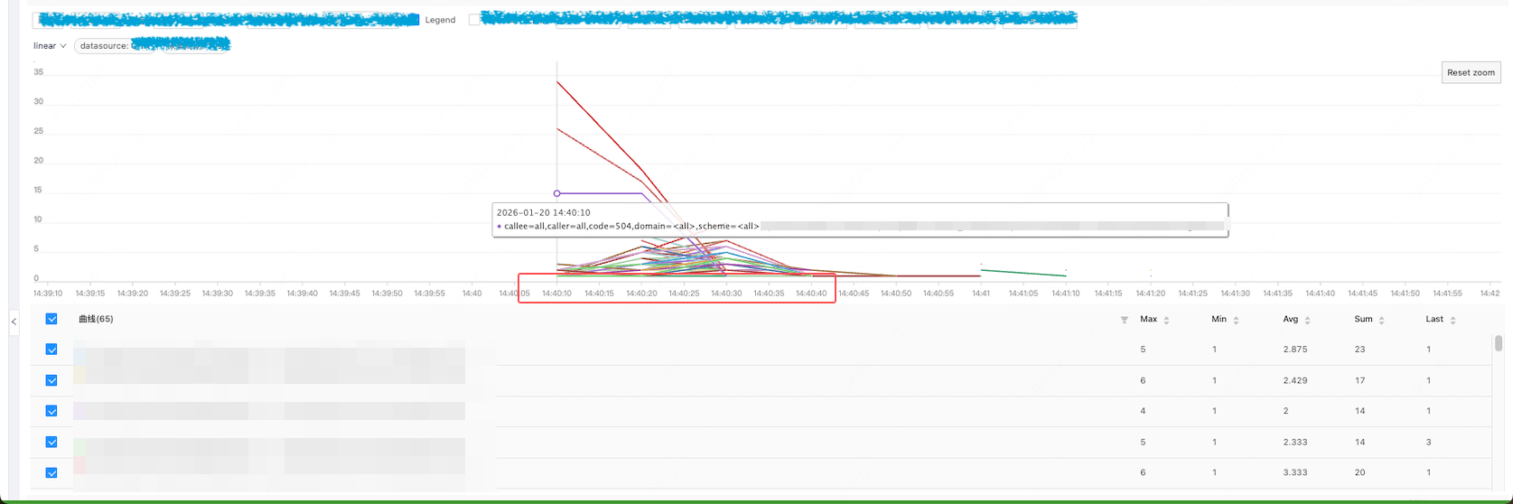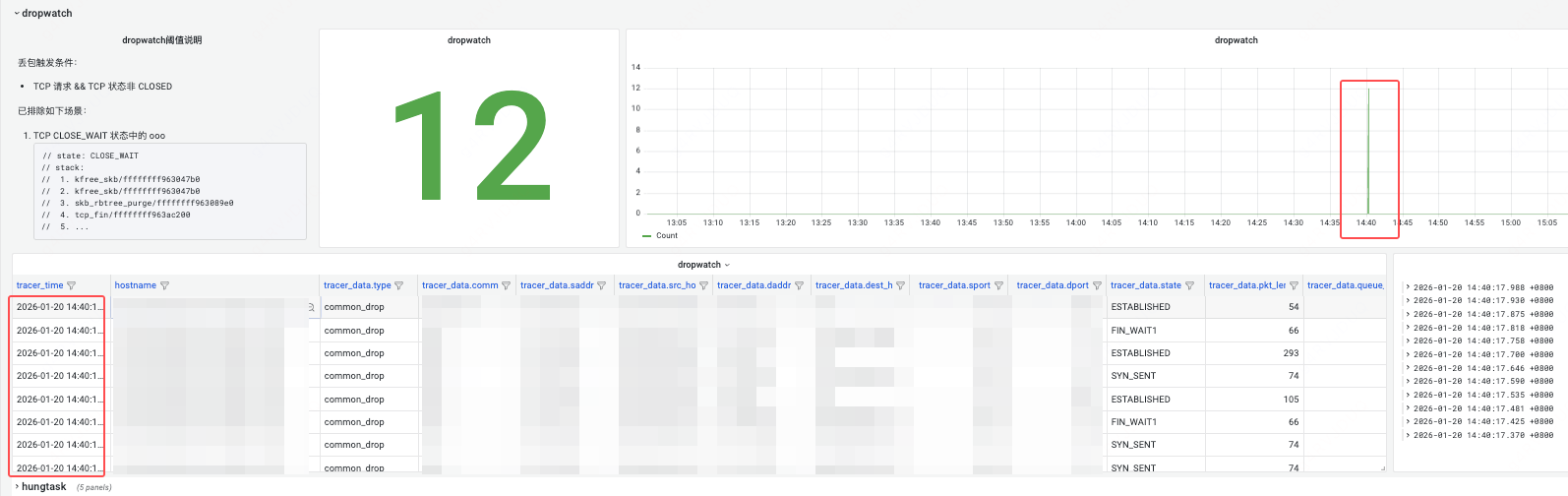 重点来了!为了揭开这 504 背后的神秘面纱,祭出 HUATUO autotracing 大法,通过观察 HUATUO autotracing 大盘,惊奇地发现 HUATUO 在 14:40 抓取到多起宿主机 dropwatch 丢包事件: