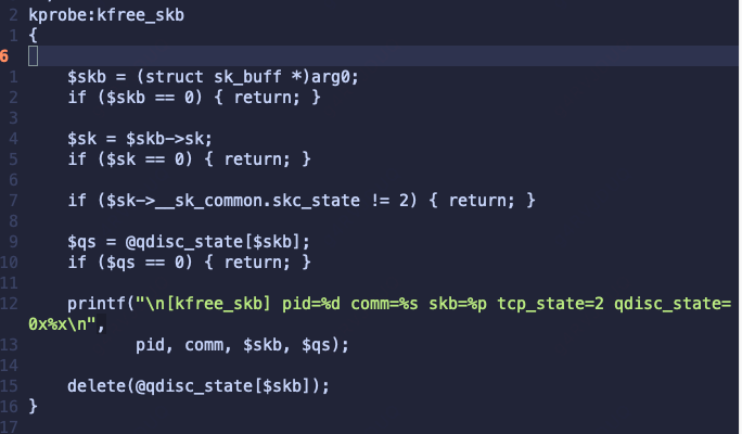 然而,当前存在两个执行路径会将 skb 赋值给 to_free 进行释放。这很可能是由于 qdisc 的状态为 __QDISC_STATE_DEACTIVATED,从而导致丢包。为验证这一推断,我们继续使用以下 BPF 脚本来捕获 kfree_skb 调用时 qdisc 的状态(即 q->state):