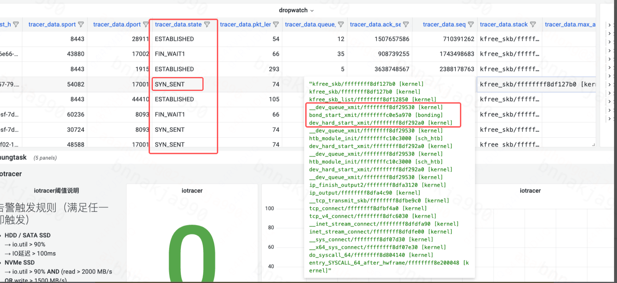 通过 HUATUO 大盘发现,丢包出现在 TCP 建立连接(SYN_SENT、FIN_WAIT1)和数据传输(ESTABLISHED)阶段。从调用栈可见,丢包时的最终调用函数均为上图标红的三个函数,且都是在发送时丢包。