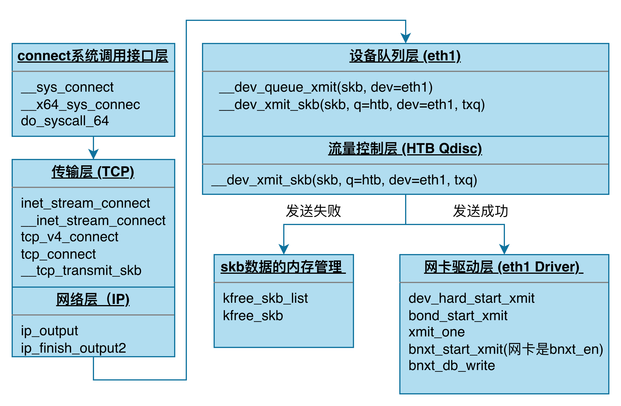 小提示:可依据上图的skb传输流程进行层级映射,结合 dropwatch 捕获的内核丢包调用栈,从而精确定位丢包发生于协议栈的具体环节。