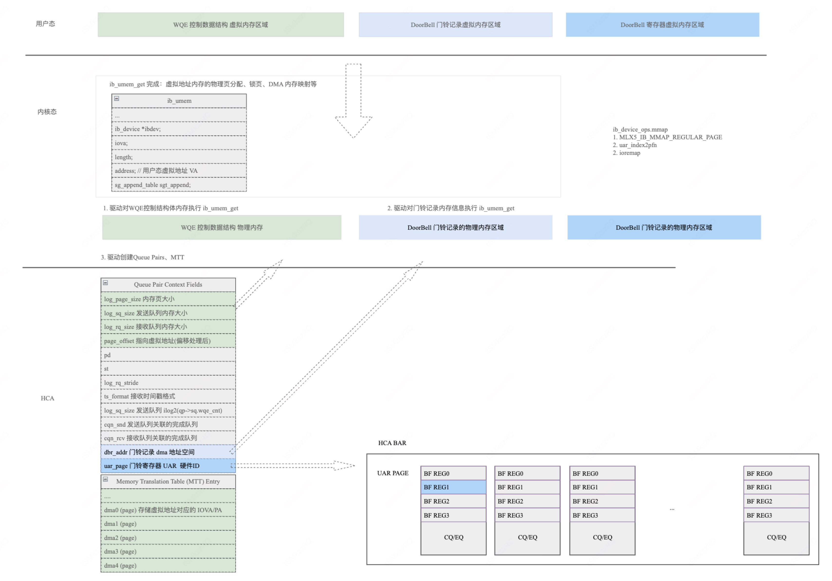 create_user_qp // 1. Selects an available bfreg from the already allocated context->bfregi. bfregn = alloc_bfreg(dev, &context->bfregi); // 2. Obtains the sys_page based on bfreg, storing the UAR ID. uar_index = bfregn_to_uar_index(dev, &context->bfregi, bfregn, false); // 3. Associates the QP with the UAR ID. MLX5_SET(qpc, qpc, uar_page, uar_index); // 4. Returns the associated index. resp->bfreg_index = ...;