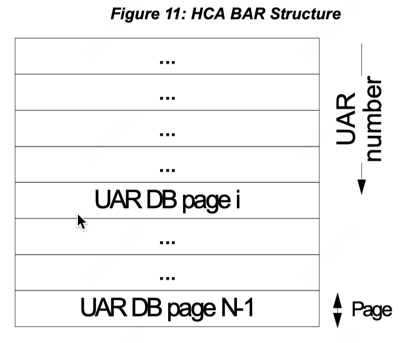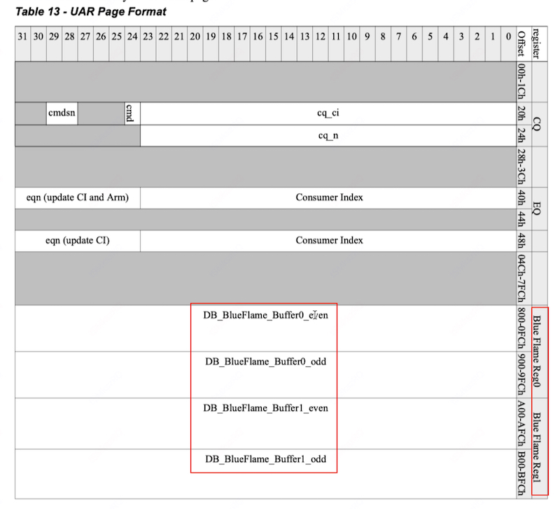 The UAR is a region within the PCI address space. It contains device memory and registers. (Users may control the device via registers). The memory space address of the UAR is exposed as a PCI BAR and mapped to kernel space via IO-mapped I/O. A UAR typically occupies one system page of memory. At the driver layer, different UARs are mapped for different processes to achieve resource isolation. Furthermore, the CPU can directly access the mapped memory. This reduces context switches between kernel mode and user mode, thereby lowering latency. A very typical use case for the UAR is the Doorbell Register. A user-mode process may write directly to the Doorbell Register to trigger a hardware operation. The UAR has applications in scenarios such as NIC communication, storage services, and GPU computing. The primary components of the Mellanox NIC UAR Page format layout are: