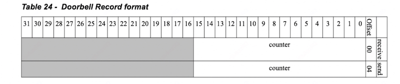sq_wqebb_counterorwqe_counterfor send and RQ respectively - For send request ring DoorBell by writing to the Doorbell Register field in the UAR associated with that queue. For performance-critical send WQEs DoorBell can be rang by using the BlueFlame mechanism.