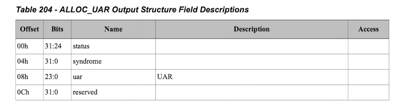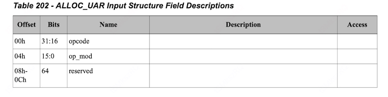 CONFIG_PAGE_SHIFT, which is typically 4K. It should also be understood that the total number of BFREGs per UAR isNUM_BFREGS_PER_UAR(4). Among these,MLX5_NUM_NON_FP_BFREGS_PER_UAR(2) are used for the slow path (No Fast Path). In the kernel implementation,mlx5_ib_alloc_ucontextcallscalc_total_bfregsto initializemlx5_bfreg_infobased on the request and hardware configuration information. Finally,mlx5_ib_alloc_ucontextcallsallocate_uarsto allocate hardware UARs. The command parameters and return values for the Mellanox hardware UAR resource creation command are shown in the following figure.calc_total_bfregs // One UAR corresponds to one system page (4K). // Each UAR contains NUM_BFREGS_PER_UAR (4) BFREGs, // two of which are used for the non-fast path MLX5_NUM_NON_FP_BFREGS_PER_UAR. // // total_num_bfregs 16 static registers (the number of registers requested by the user mode) // Since each UAR supports MLX5_NUM_NON_FP_BFREGS_PER_UAR (2) slow-path registers, // 8 UARs are required, i.e., 8 system pages. bfregi->num_static_sys_pages = 8; bfregi->num_dyn_bfregs = 1024; // Dynamic registers, default is 1024 // Dynamic + Static registers: 1040 bfregi->total_num_bfregs = req->total_num_bfregs + bfregi->num_dyn_bfregs; // Total system pages required: 8 bfregi->num_sys_pages = req->total_num_bfregs / 2; bfregi->sys_pages = kcalloc(bfregi->num_sys_pages, ....);allocate_uars // Allocates num_static_sys_pages hardware UAR resources for (i = 0; i < bfregi->num_static_sys_pages; i++) { // sys_pages stores the UAR ID. This information is returned by the hardware. mlx5_cmd_alloc_uar(dev->mdev, &bfregi->sys_pages[i]); }